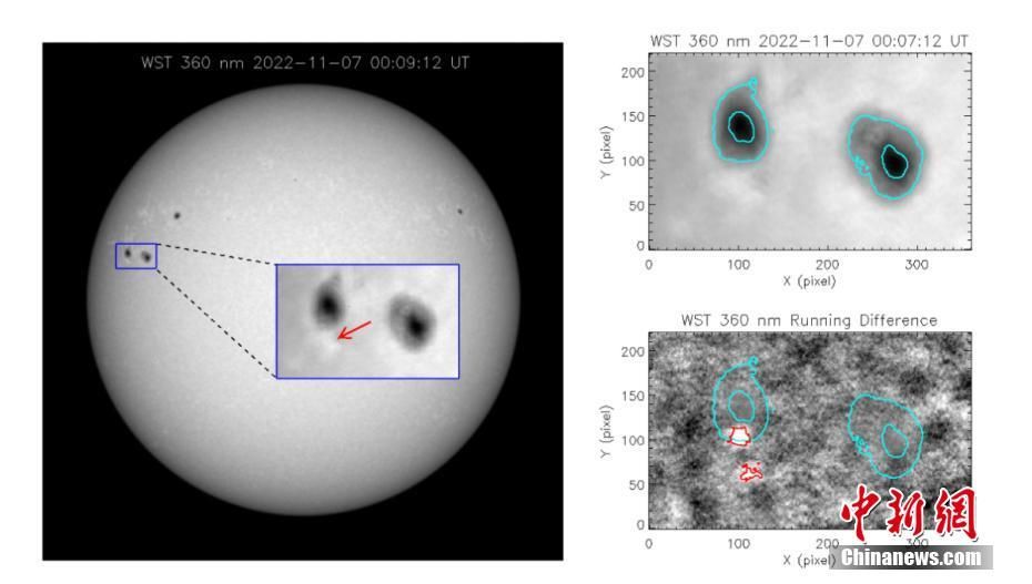 “夸父一号” WST/LST在11月7日观测到1个白光耀斑,右边红色等值线为连续谱增强位置相对黑子的位置。