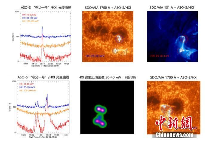 12月13日,中国综合性太阳探测卫星“夸父一号”卫星首批科学图像新闻发布会,在位于北京怀柔科学城的中国科学院国家空间科学中心举行。夸父一号”自2022年10月9日成功发射以来,3台有效载荷在轨运行2个月期间获取的若干对太阳的科学观测图像正式对外公布,最新发布成果实现多项国内外首次,在轨验证了“夸父一号”三台有效载荷的观测能力和先进性。图为“夸父一号” HXI在2022年11月11日“双11”观测到的一个C级耀斑硬X射线成像与AIA/SDO紫外1700图像的比较。
