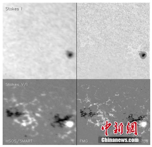 “夸父一号”FMG在轨观测的局部单色像和磁图(右边)与怀柔地面全日面磁场望远镜对同一时间同一日面区域观测的结果(左边)对比。