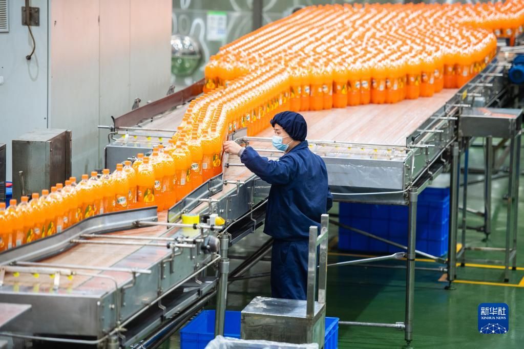近日,湖南宁乡经济技术开发区内的多个食品加工企业开足马力忙生产,保障市场供应。图为12月13日,在长沙顶津食品有限公司饮品生产车间,工作人员在检查饮料品质。新华社