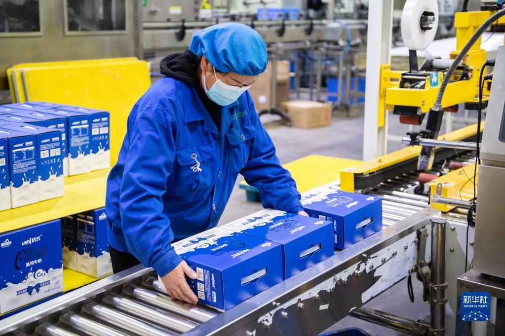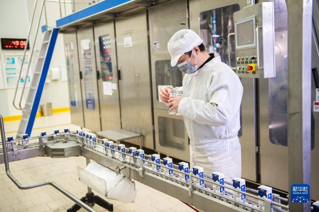 12月13日,在皇氏集团湖南优氏乳业有限公司饮品生产车间,工作人员在做成品出库前检查。新华社