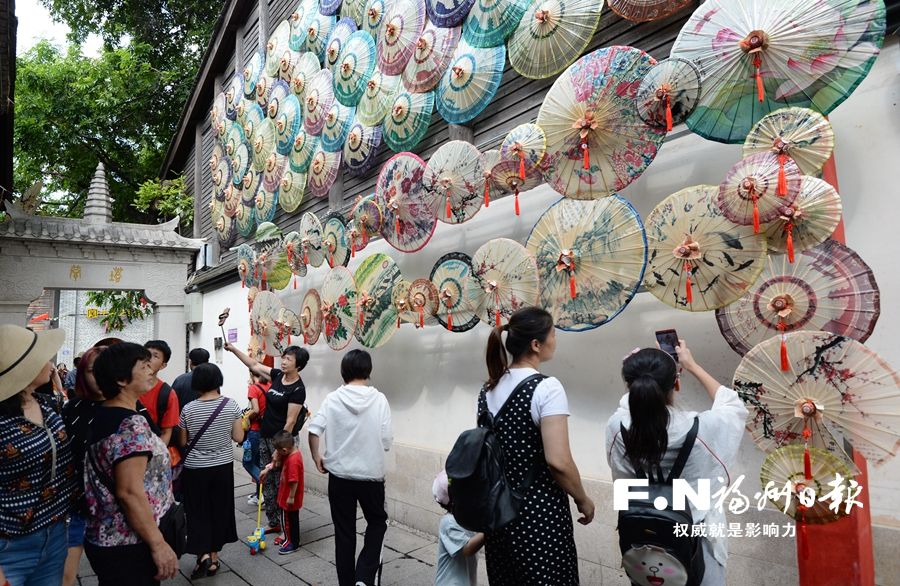 福州油纸伞是历史悠久的汉族传统手工艺品,属于福州三宝之一。做工精细,采用油画、彩画喷花和绢印等方法,在纸伞上绘制了花鸟、山水、人物等图案,十分雅致美观。在巷口的一堵由上百把大小不一、图样各异、色彩鲜明的油纸伞装点的伞墙,游客纷纷被这浪漫的装饰吸引,驻足观赏拍照。福州日报