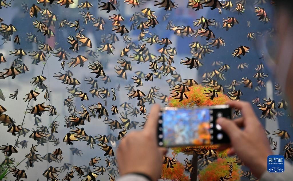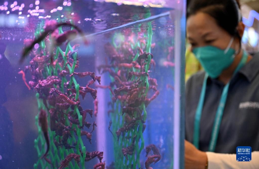 12月15日,为期四天的2022年中国(海南)国际热带农产品冬季交易会(简称“冬交会”)在海口开幕,18个省份的1200家企业、2000多个品类参展。展品涉及瓜果蔬菜、粮油、水产、畜牧等。图为12月15日,观众在参观海南文昌展台展示的养殖海马。新华社