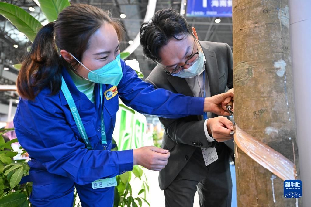 12月15日,观众在工作人员的指导下体验割胶。新华社