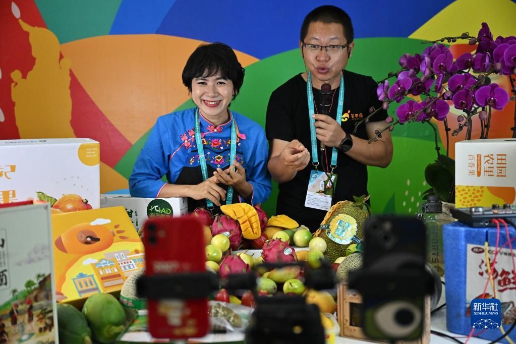 12月15日,海南三亚展台的工作人员在直播销售农产品。新华社