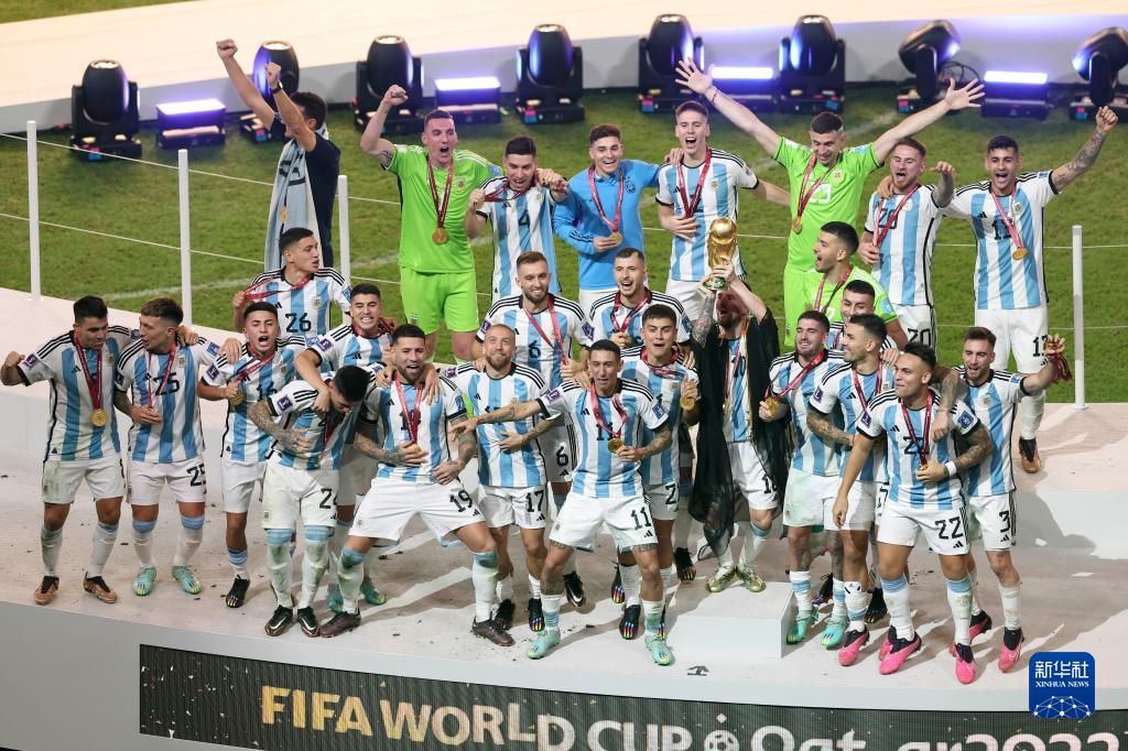 12月18日,阿根廷队球员在颁奖仪式上庆祝夺冠。新华社