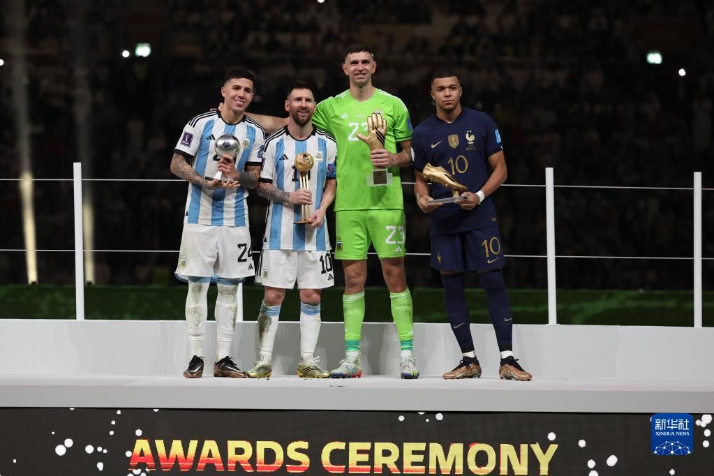 12月18日,在本届世界杯上获得最佳新秀奖的阿根廷队球员恩佐·费尔南德斯(左一)、获得金球奖的阿根廷队球员梅西(左二)、获得金手套奖的阿根廷队守门员马丁内斯(右二)与获得金靴奖的法国队球员姆巴佩在颁奖仪式上合影。新华社