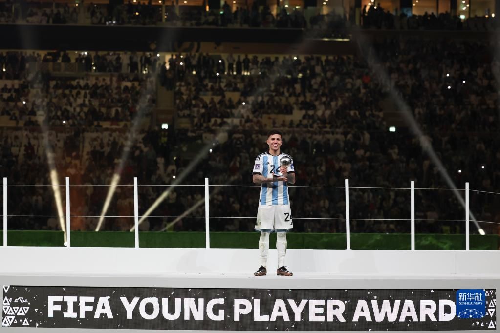 12月18日,获得世界杯最佳新秀奖的阿根廷队球员恩佐·费尔南德斯在颁奖仪式上。新华社
