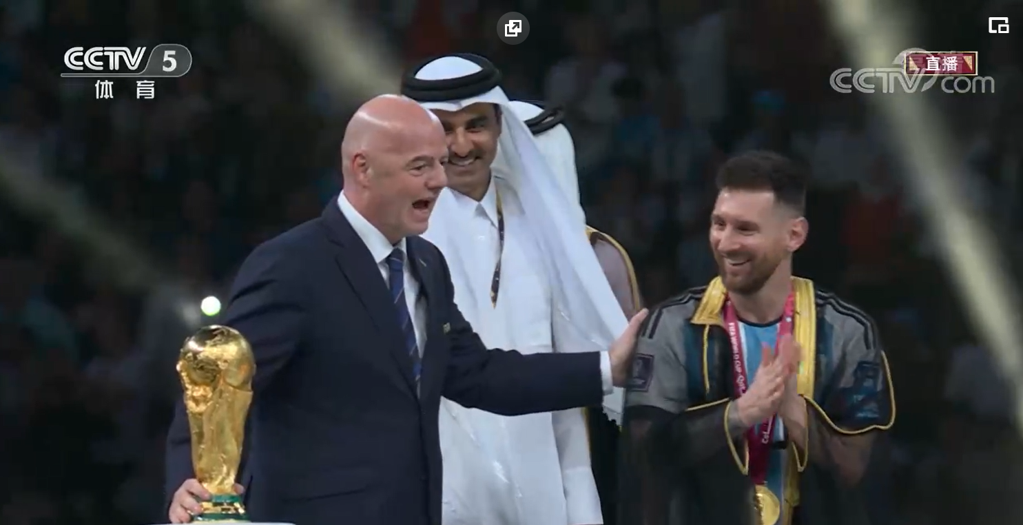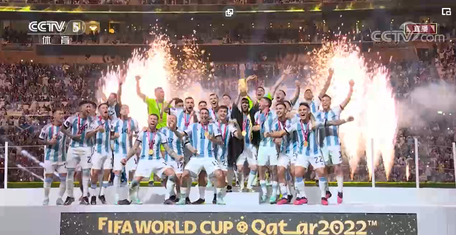 12月18日,阿根廷队球员在颁奖仪式上庆祝。央视网截图