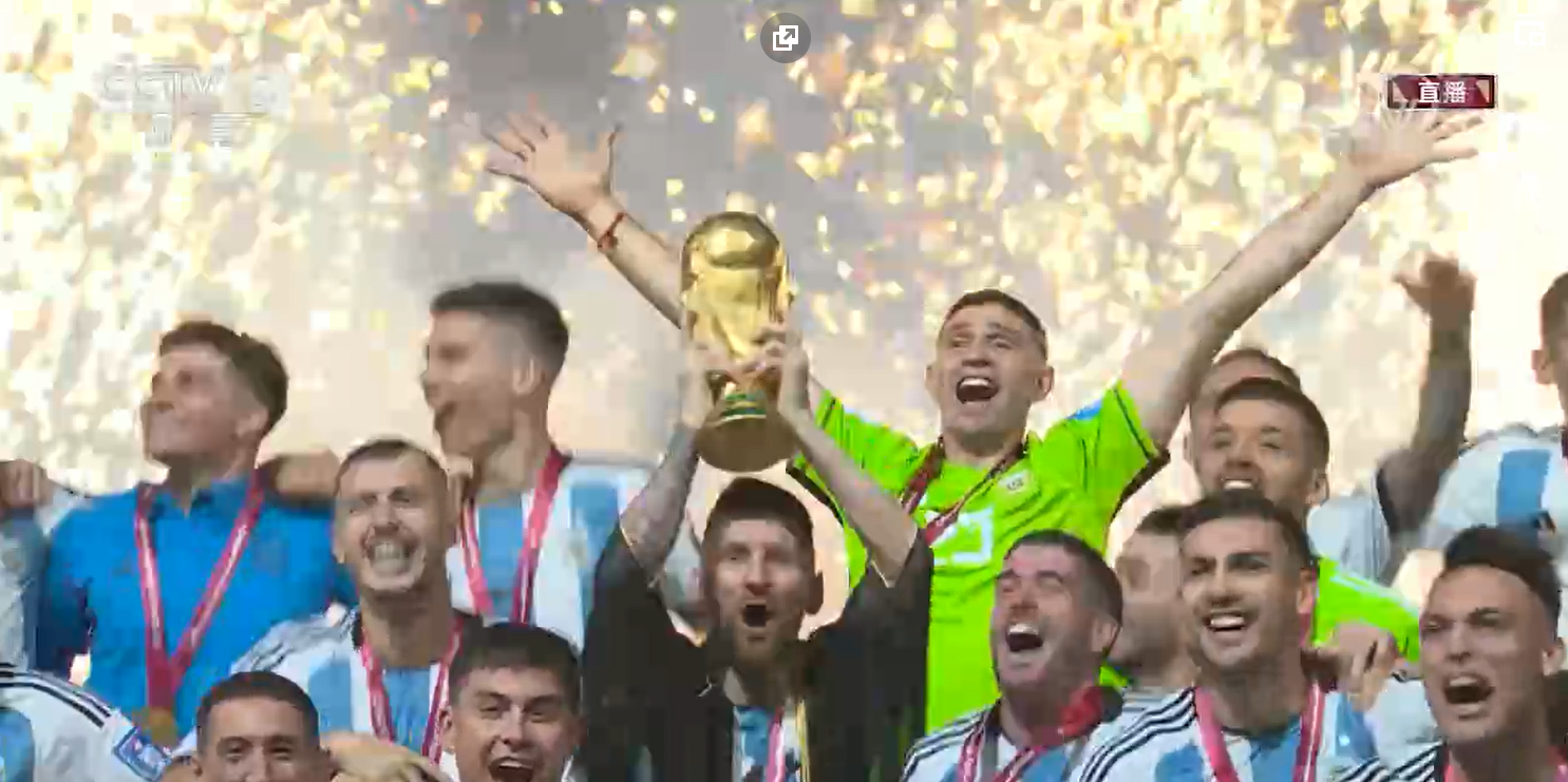 12月18日,在卡塔尔卢赛尔球场进行的2022卡塔尔世界杯足球赛决赛中,阿根廷队与法国队在常规时间和加时赛战成3比3平,通过点球大战阿根廷队以总比分7比5获胜,夺得冠军拿到了他们队史第三座金杯。梅西实现荣誉大满贯!