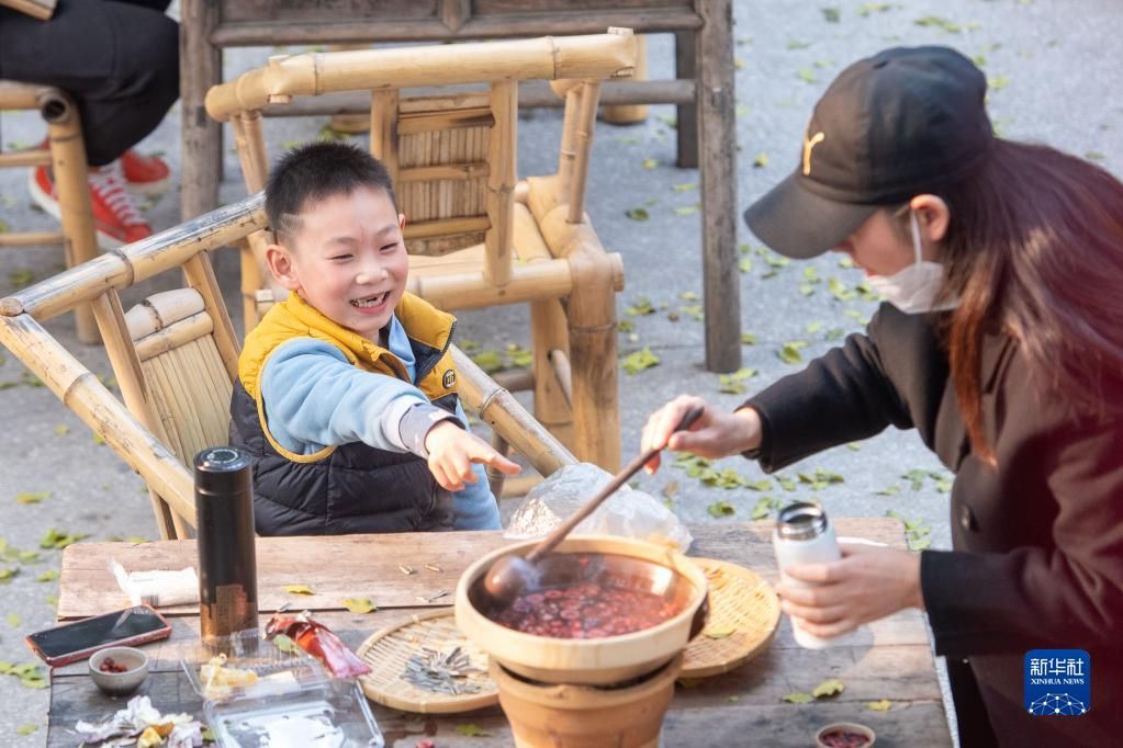 12月24日,在位于重庆解放碑商圈的著名景点山城巷的一家店内,游客品尝特色餐饮。新华社