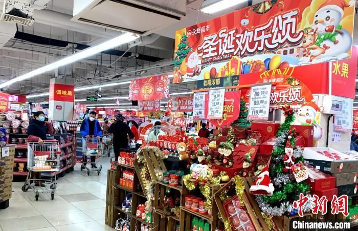 12月25日,福建福州,市民在超市购物。受线上购物运力下降的影响,福州线下实体店购销两旺。图为超市节庆气氛渐浓。中新网