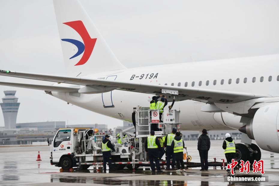 工作人员正在给C919国产大飞机加注燃油。中新网