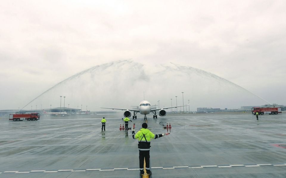 在成都天府国际机场,C919过“水门”。四川《华西都市报 》