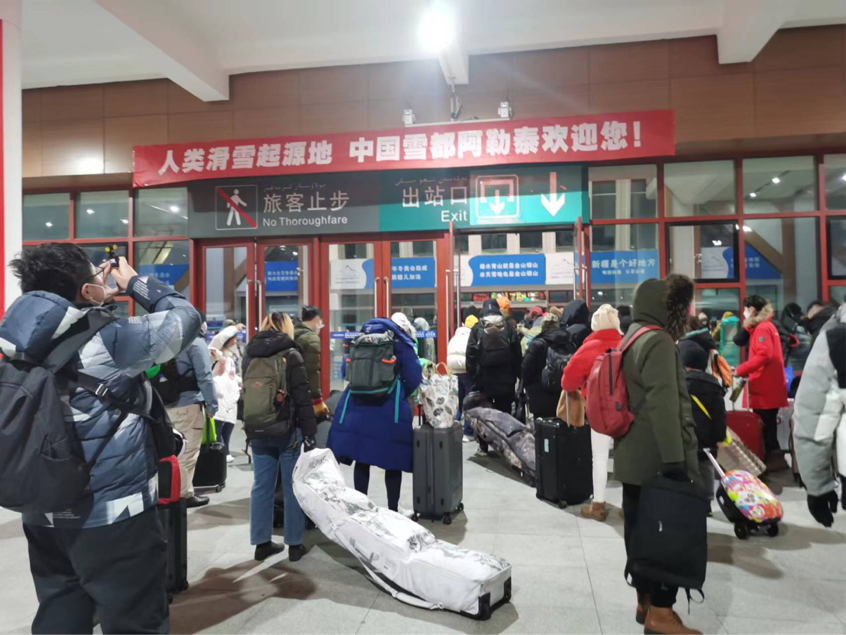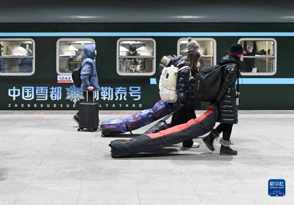 12月28日,旅客在乌鲁木齐站准备登上Y965次“中国雪都·阿勒泰号”冰雪游旅客列车。《中国日报》