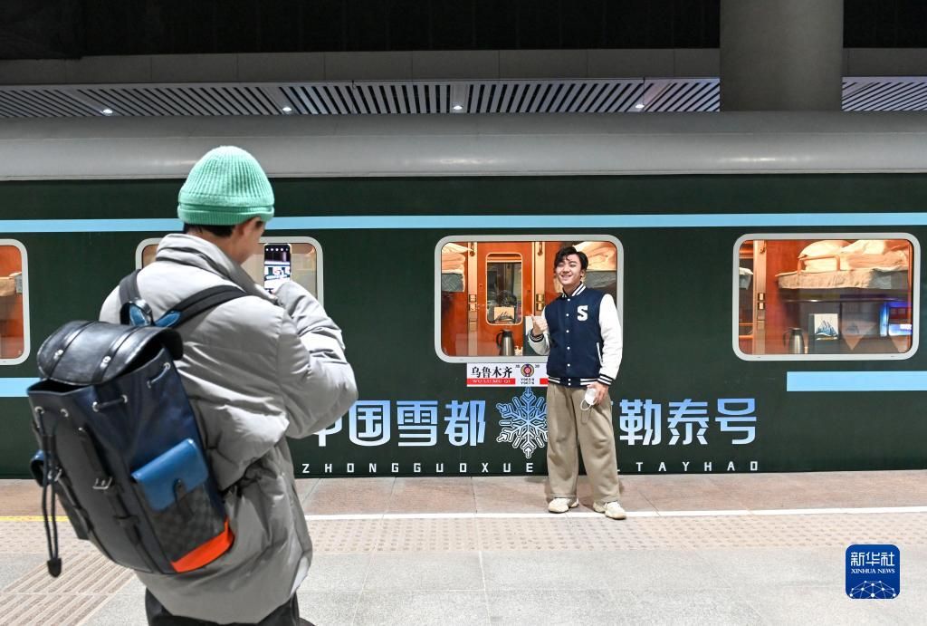 12月28日,“中国雪都·阿勒泰号”冰雪游旅客列车从新疆乌鲁木齐出发,驶向阿勒泰地区富蕴县。运行距离908公里,全程仅经停北屯、阿勒泰2个客运站,旅时进一步压缩,并留足昼间冰雪游、晚间乘车休息的时间。列车外观装涂有“中国雪都阿勒泰号”与六瓣雪花图案,字样与图案均采用蓝白渐变色调,象征着蓝天白雪的自然美景,既呼应阿勒泰“雪都”之名,又与列车“冰雪旅游”的主题相契合,别出心裁又隐含着地域文化的美好寓意。图为乘坐“中国雪都·阿勒泰号”的旅客合影留念。《中国日报》