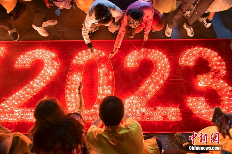近期中国多地举办多场迎春灯会,迎接2023年新春佳节到来。丰富多彩的灯会营造了欢乐祥和的节日气氛。徜徉在流光溢彩的彩灯长街上,逛庙会,看民俗表演,品尝特色美食,享受别有风味的热闹体验。图为2022年12月31日晚,三亚民众在海南三亚南山文化旅游区举行点灯祈福活动,迎接2023年的到来,祝愿国泰民安。图为民众点亮“2023”字样的蜡灯祈福。中新网