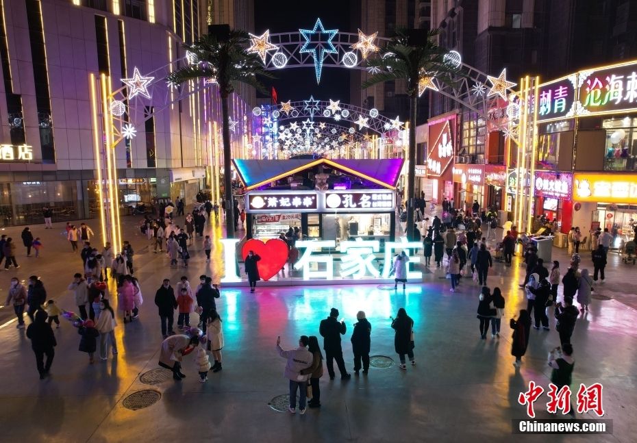 2022年12月31日晚,河北石家庄街头灯光璀璨、新年气氛浓,吸引民众在此跨年迎新。(无人机照片) 中新网