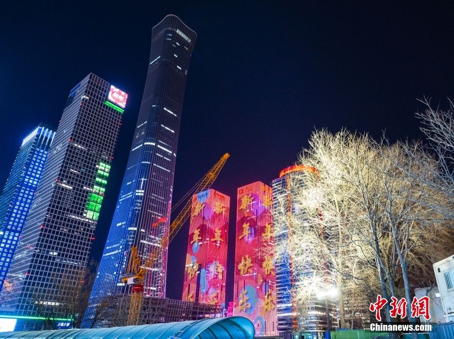 2022年12月31日晚间,北京市中央商务区(CBD)的建筑外墙亮起彩灯,迎接2023年新年。 中新网