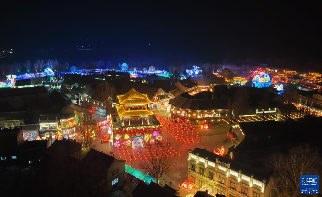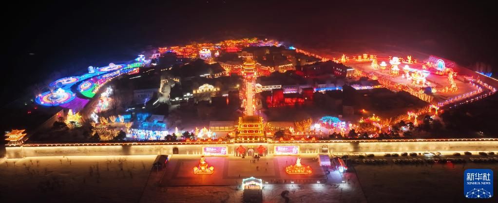 2022年12月30日,2023沈阳国际冰雪节暨沈阳迎春灯会在沈阳关东影视城拉开帷幕。本届灯会制作各类大型灯组70余组,占地2万余平方米,吸引众多市民参观游玩。图为2022年12月31日拍摄的沈阳迎春灯会全景(无人机照片)。新华社