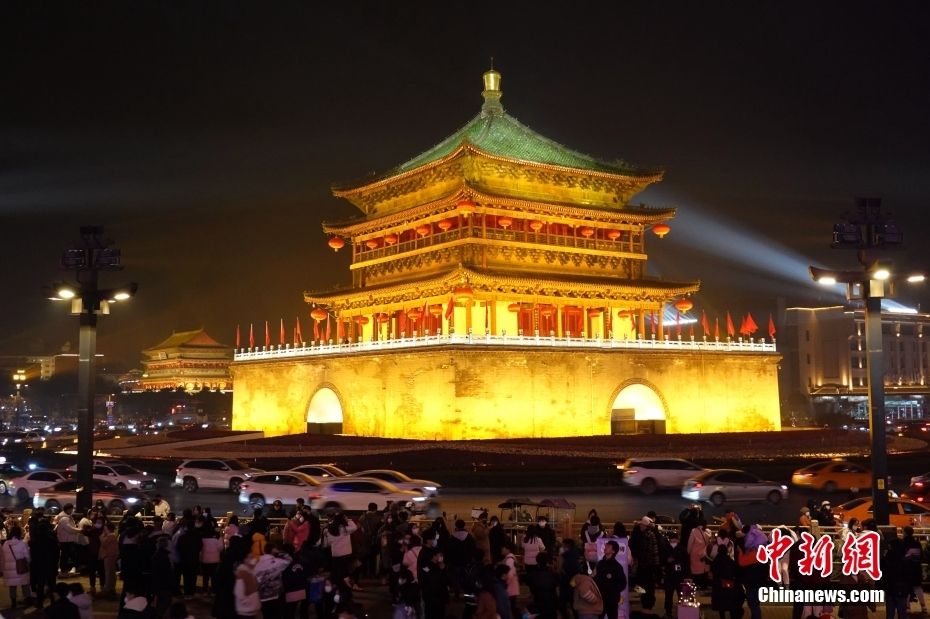 2022年12月31日,陕西西安,钟楼附近及回民街人头攒动。当日夜晚,大量民众来此游玩跨年。图为钟楼下人头攒动。 中新网