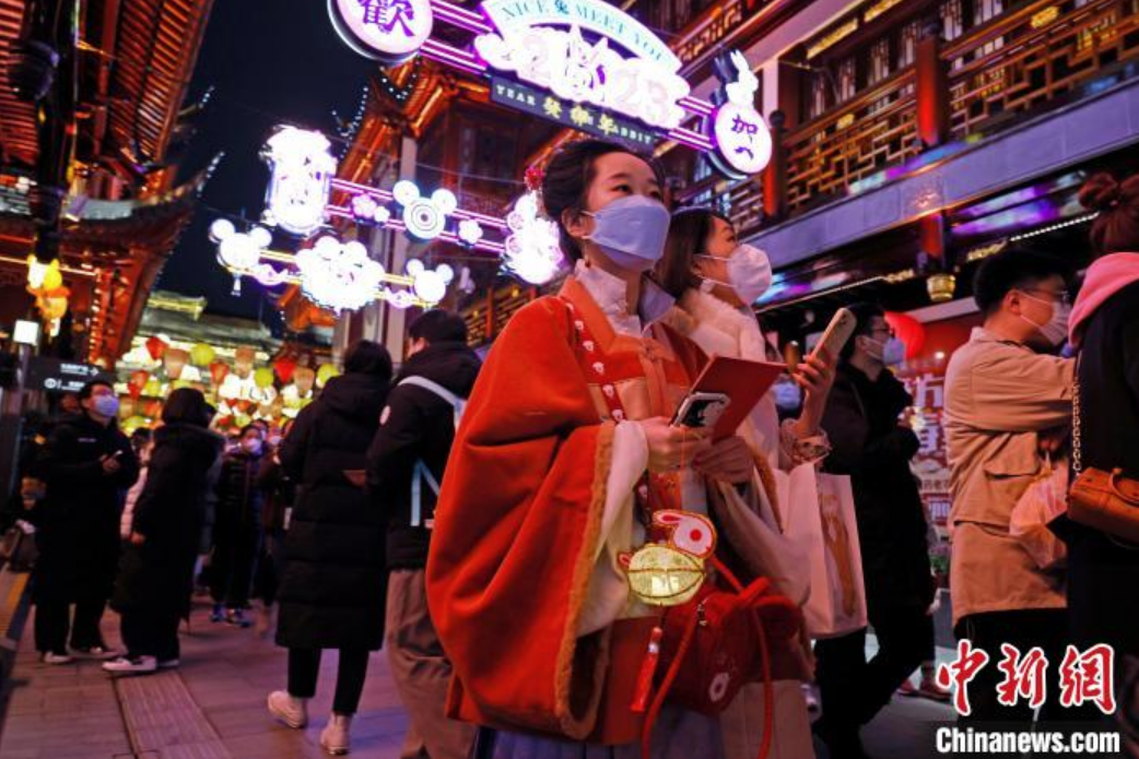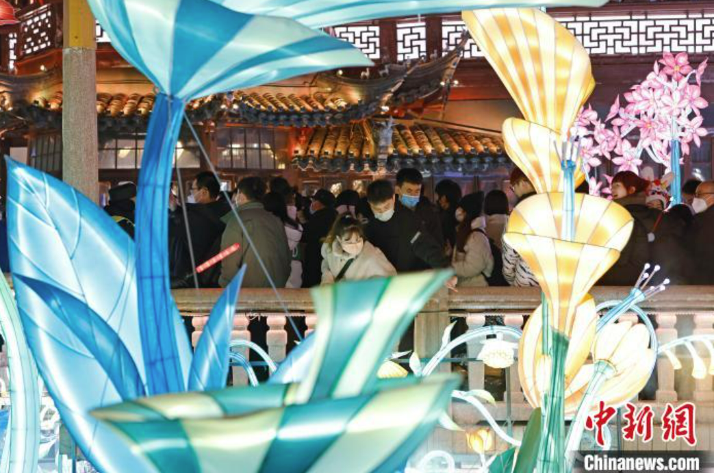 1月1日晚,游客在上海豫园观赏新年灯会。12月26日,2023豫园灯会正式启幕,灯会将持续至2023年2月15日落幕,为期52天。此次豫园灯会以“山海奇豫记”为主题,以中国传统神话《山海经》为蓝本,融非遗艺术灯彩、沉浸式国风体验、线上线下趣味互动于一体,打造一场文化大美的新春灯会。据了解,豫园灯会将于元旦、春节、元宵期间实行分时段购票入场。图为游客在上海豫园观赏新年灯会。中新网