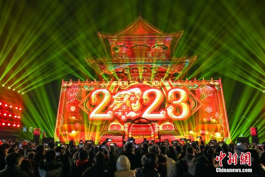 2022年12月31日晚,天津鼓楼举办主题灯光投影秀跨年活动,迎接2023年的到来。中新网