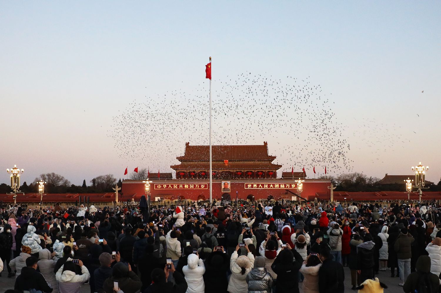 2023年1月1日,大批民众在北京天安门广场上围观升旗仪式。当日,新年伊始,伴随着第一缕阳光,北京天安门广场举行2023年第一场升旗仪式。图为2023年1月1日,升旗仪式后,一群和平鸽在天安门广场上空飞舞。南美侨报特约记者卞程宣摄