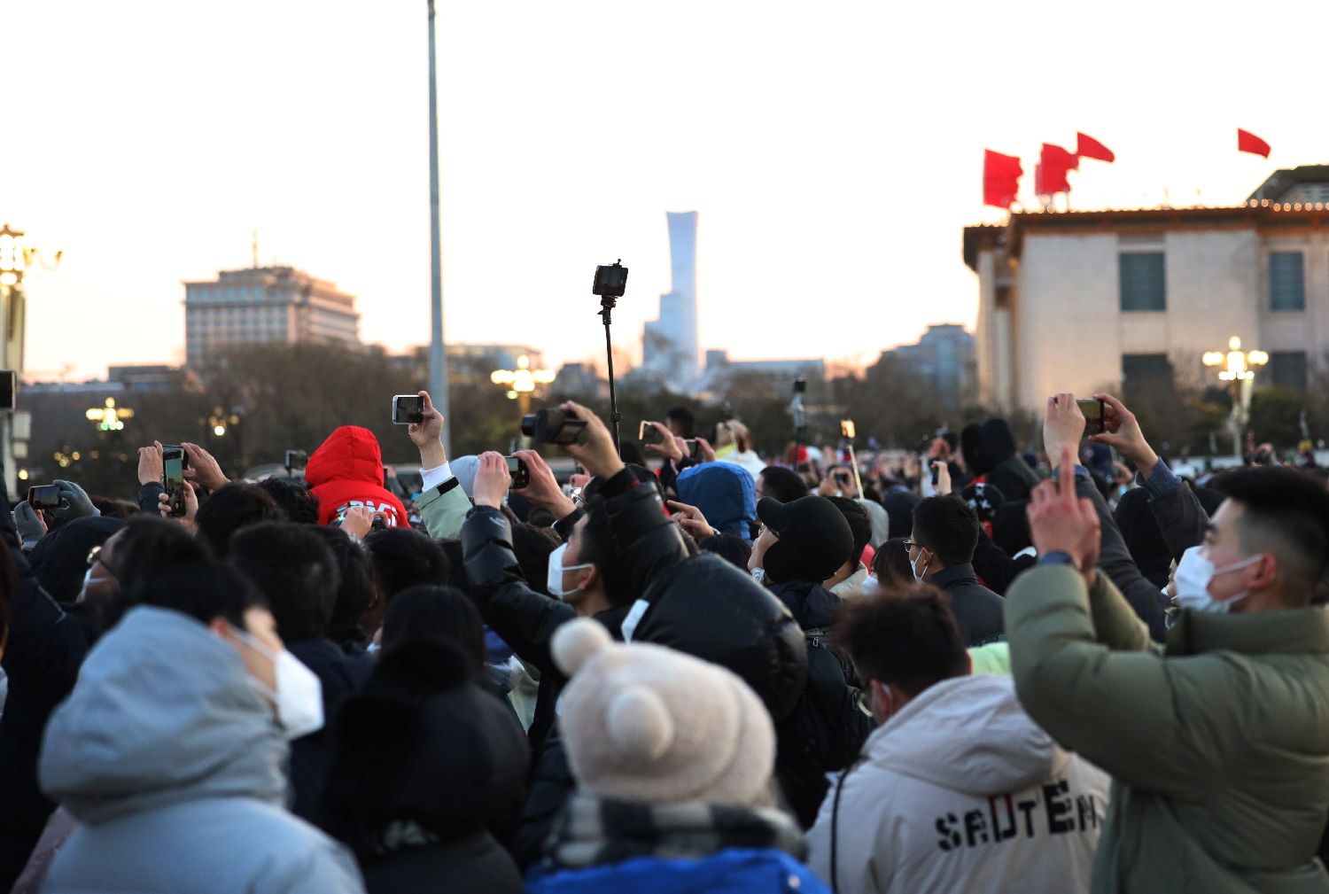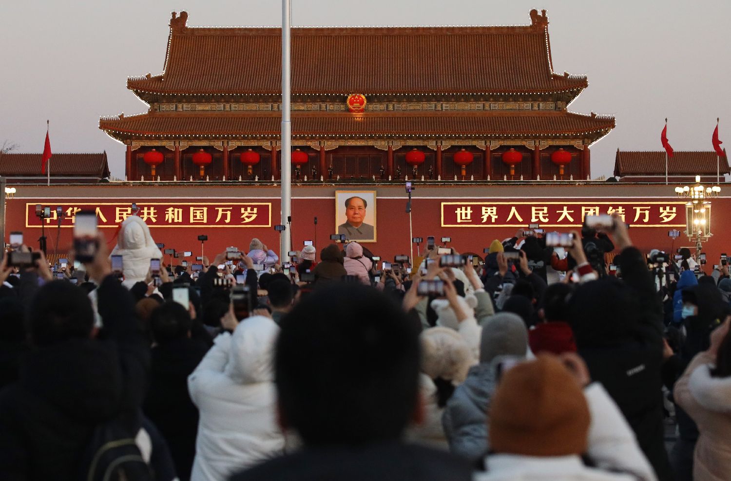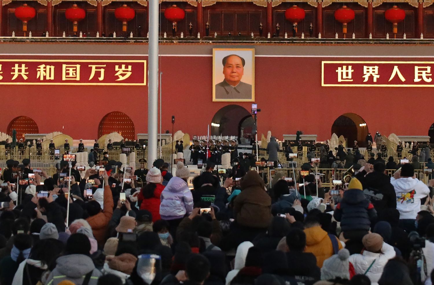 2023年1月1日,大批民众在北京天安门广场上围观升旗仪式。当日,新年伊始,伴随着第一缕阳光,北京天安门广场举行2023年第一场升旗仪式。