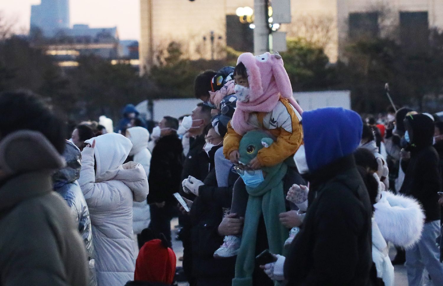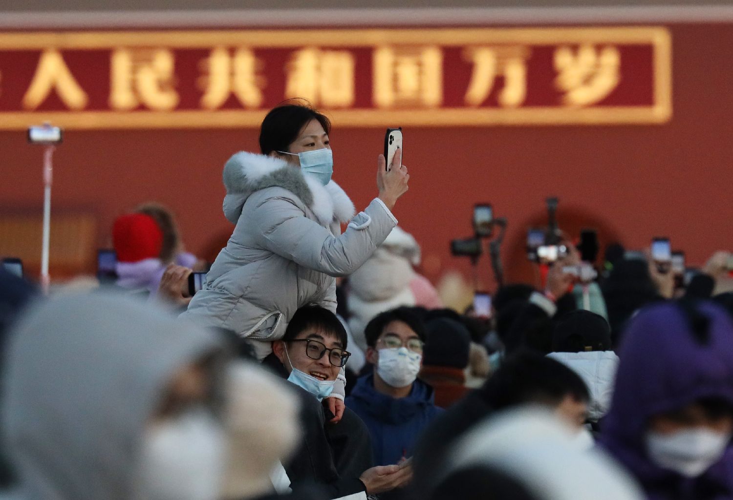 2023年1月1日,小朋友坐在家人肩膀等候观看天安门广场升旗仪式。南美侨报特约记者卞程宣摄