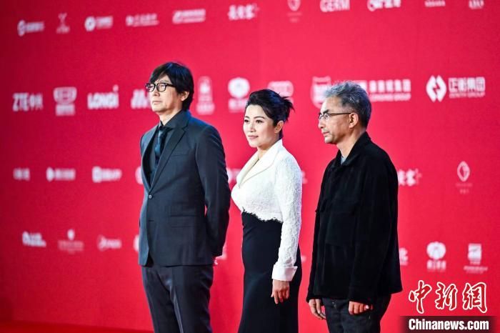 电影人刁亦男、颜丙燕、万玛才旦在红毯上合影。中新网/主办方供图