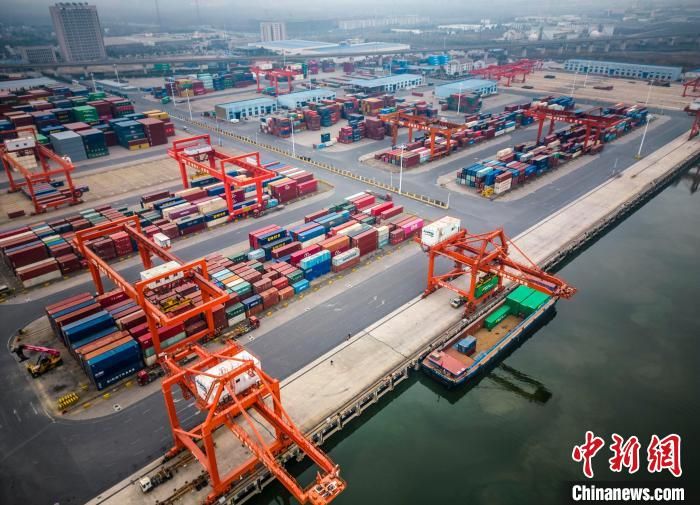 2022年全年,合肥港国际集装箱码头集装箱吞吐量超42万标准箱。图为1月1日,船舶在合肥港国际集装箱码头卸货(无人机照片)。中新网