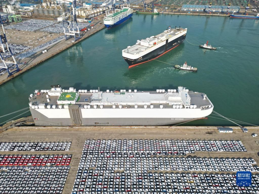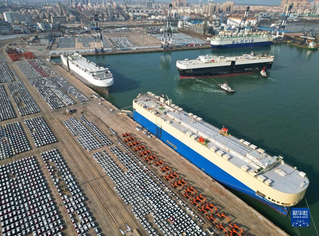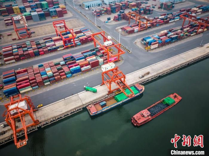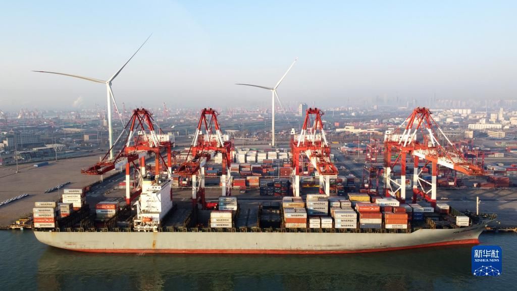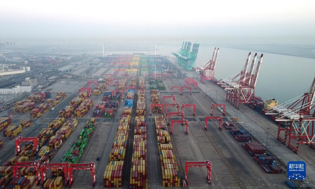 新年伊始,中国各地港口码头有序高效运行,卡车在集装箱堆场往来穿梭,岸桥高效运转装卸船舶,一派繁忙景象。
