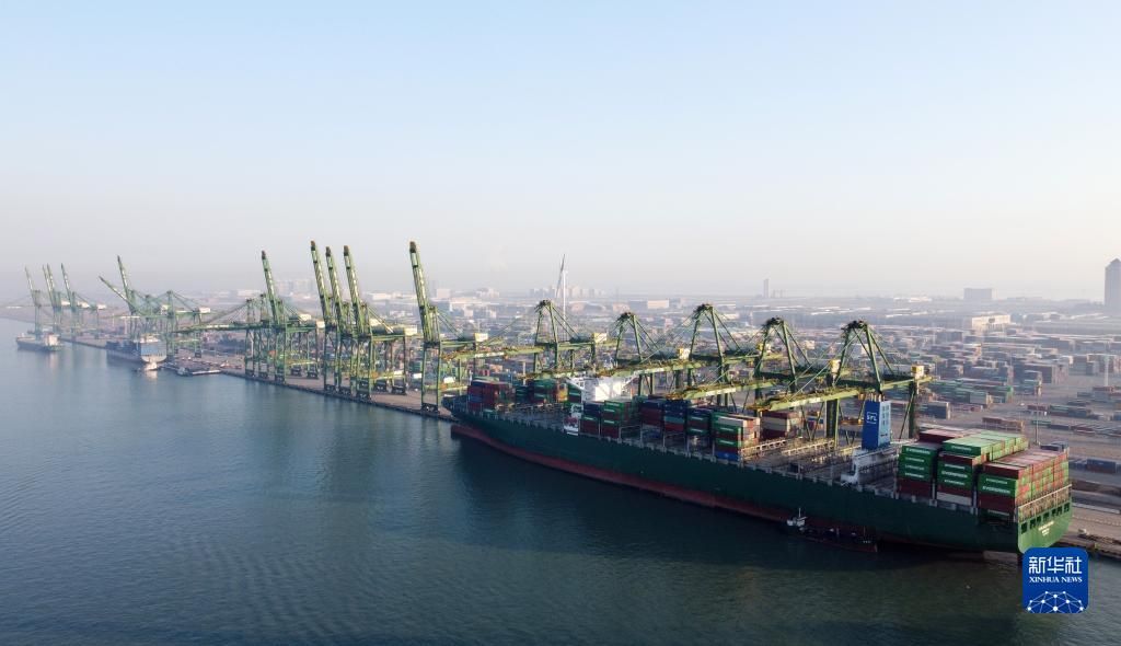 1月1日,货轮靠泊在天津港太平洋国际集装箱码头进行装卸作业(无人机照片)。新华社