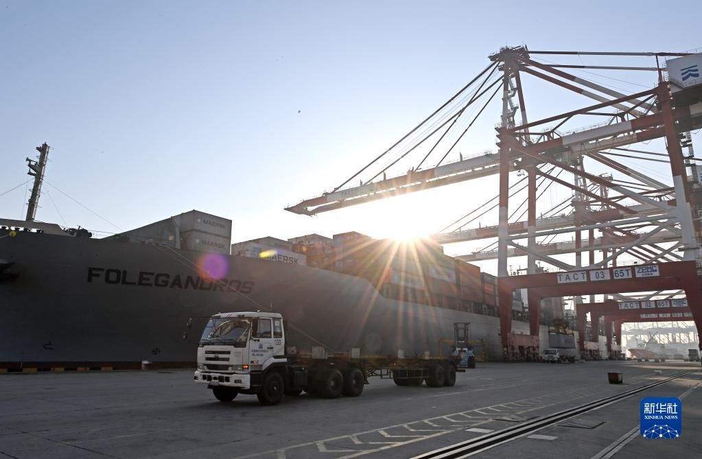 1月1日,卡车在天津港联盟国际集装箱码头运输集装箱。新华社