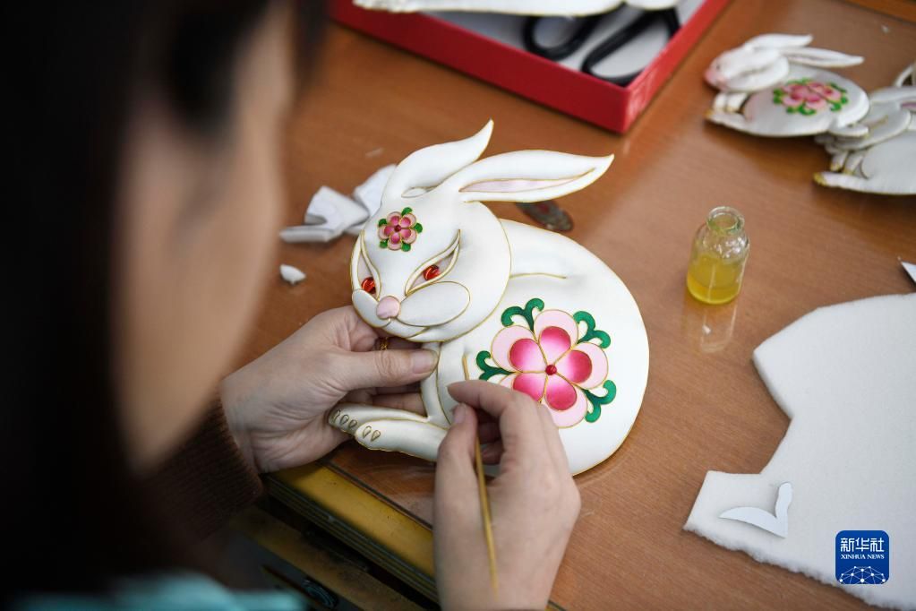 兔年春节临近,各种新春的吉祥元素也逐渐多了起来。近日,中国多名民俗艺人通过泥叫叫、葫芦刻画、布糊画、剪纸等技艺,将祥兔形象融入作品之中。这些兔子或憨态可掬,或色彩灵动,让观者在喜闻乐见中感受到非遗文化的魅力。图为1月4日,在丰宁县非遗布糊画就业工坊,手工艺人在制作兔年主题布糊画。新华社