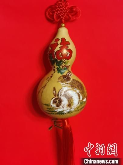 西安葫芦雕刻艺人梁平安创作的兔年葫芦作品。图为葫芦上的兔子造型可爱。中新网