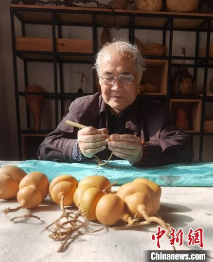 梁平安在葫芦上雕刻图案。中新网