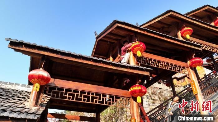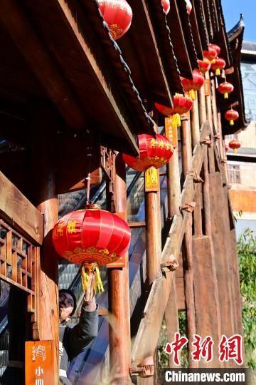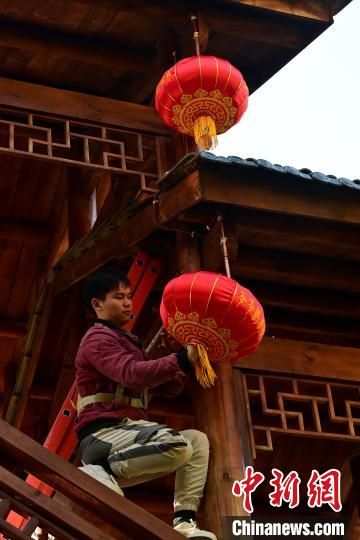 春节临近,年味渐浓。中国多地大街小巷的红灯笼高高挂起,洋溢着喜庆的节日氛围。图为重庆市酉阳土家族苗族自治县龚滩古镇,古镇居民正在悬挂大红灯笼。中新网