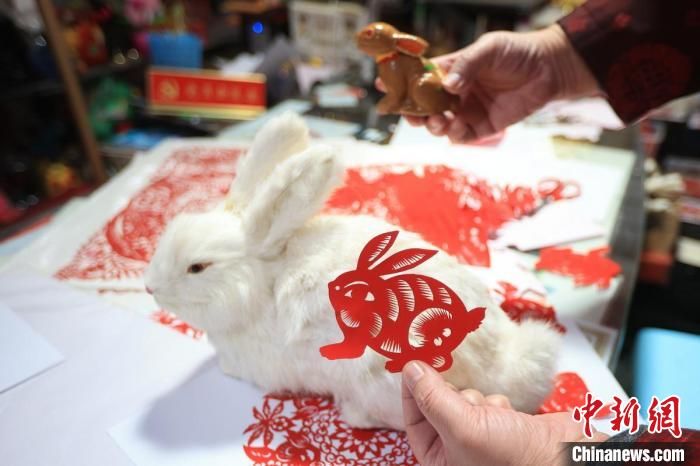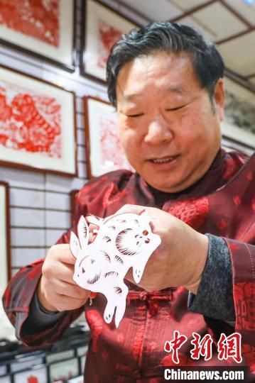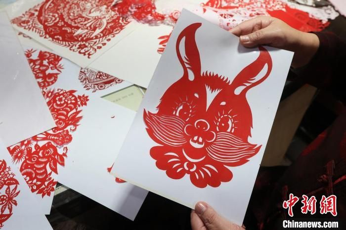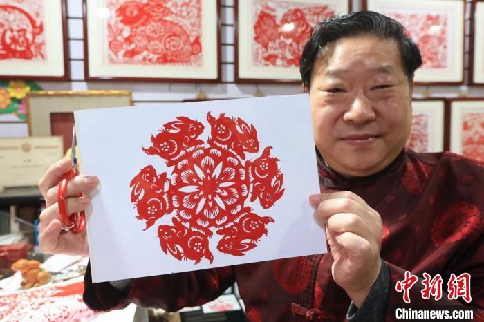 南京市工艺美术大师、非遗剪纸传承人陈耀展示他创作的兔年剪纸作品。中新网