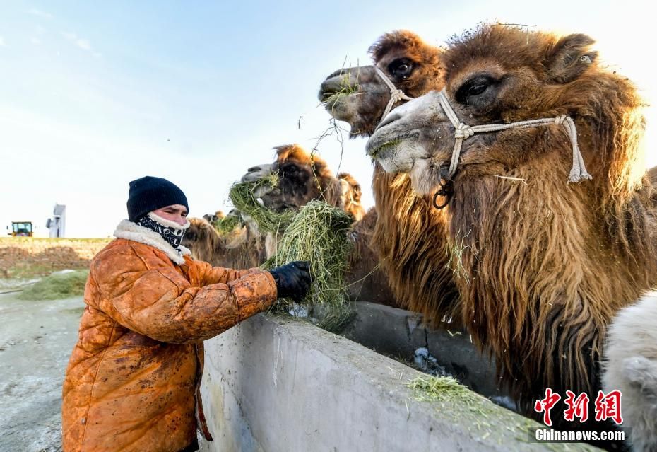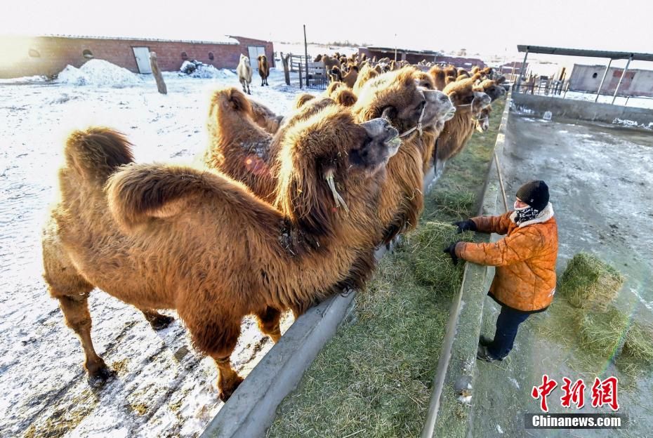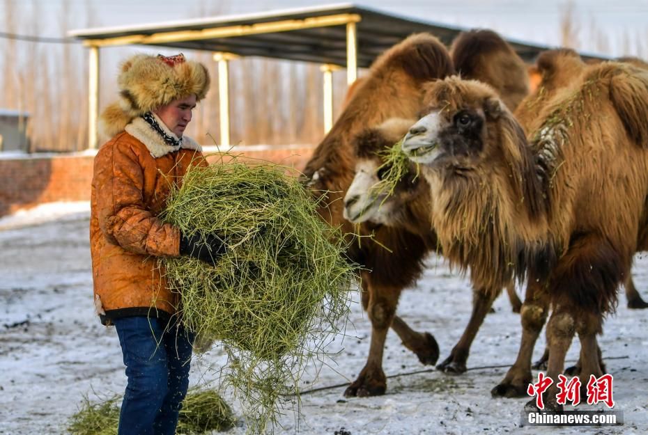 新疆阿勒泰地区福海县是新疆重要的畜牧业生产基地,得天独厚的地理、气候等条件特别适合骆驼养殖。福海县牧民那尔多斯·巴合提别克共养殖了150余峰骆驼,产奶的有50余峰,每日鲜挤的驼奶会有企业上门收购,为家庭带来了稳定而持续的收入。图为那尔多斯·巴合提别克给骆驼添加草料。