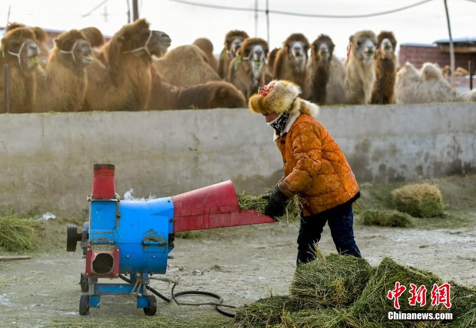 1月10日,那尔多斯·巴合提别克在自家的后院为养殖的骆驼准备饲草。