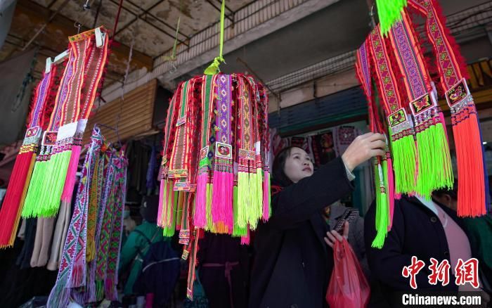春节临近,各地年货市场红红火火,人们忙着选购年货,喜迎新春佳节。图为苗族群众在贵州省丹寨县民族服装市场选购制作苗族服装的绣片。中新网