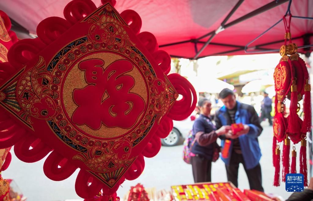 1月10日,人们在贵州省黔东南苗族侗族自治州丹寨县年货市场选购春节饰品。新华社