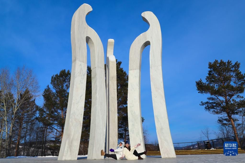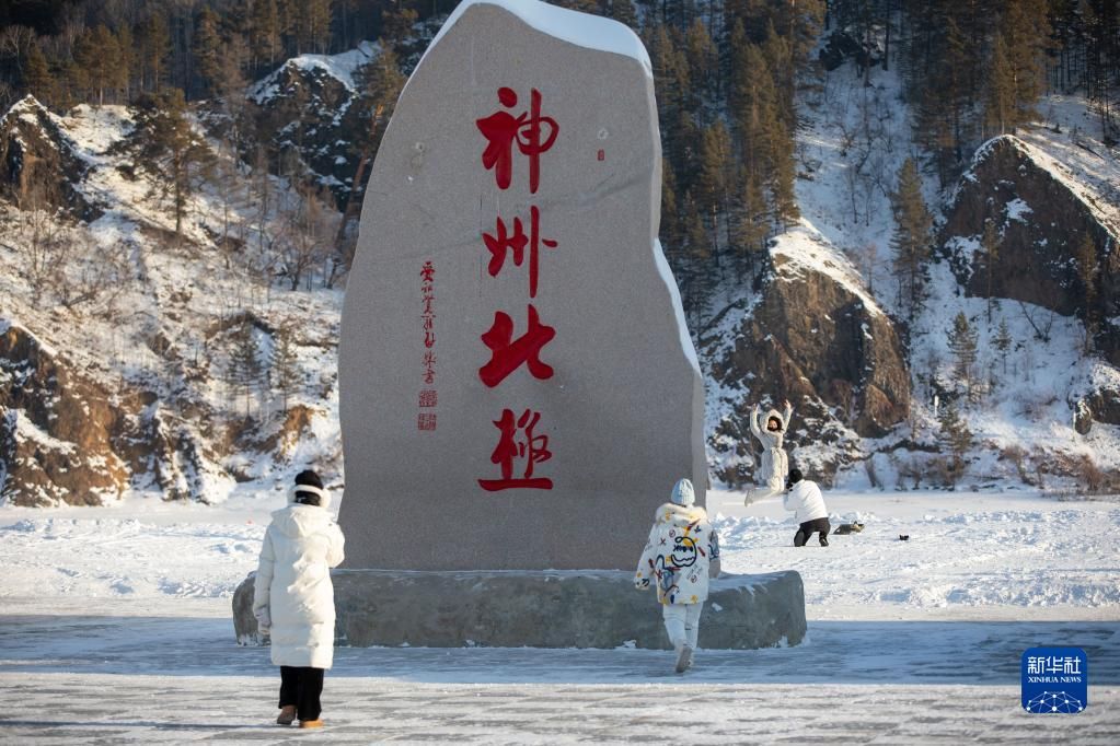 1月10日,游客在黑龙江省漠河市北极村的一处景点游玩。
