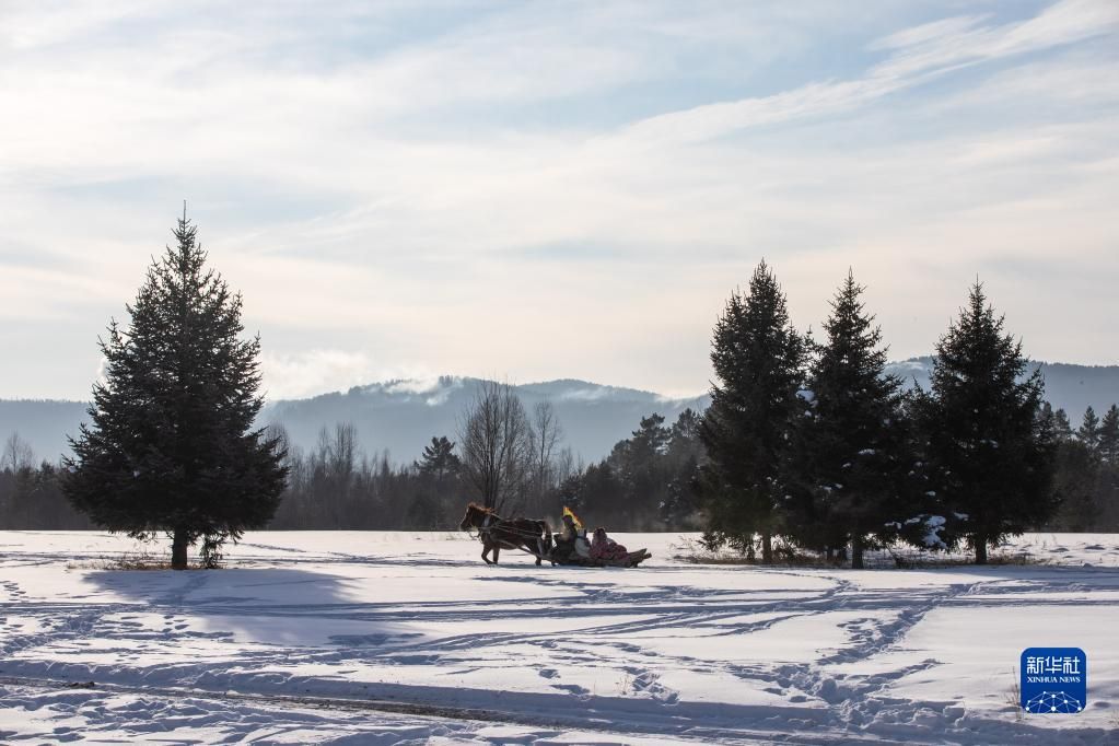 1月10日,在黑龙江省漠河市北极村,游客乘坐马拉爬犁。