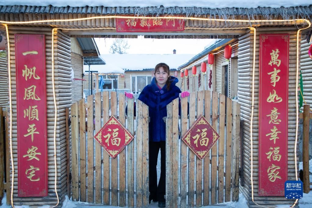 1月7日,北极村民宿经营者史瑞娟在门前等待入住的游客。