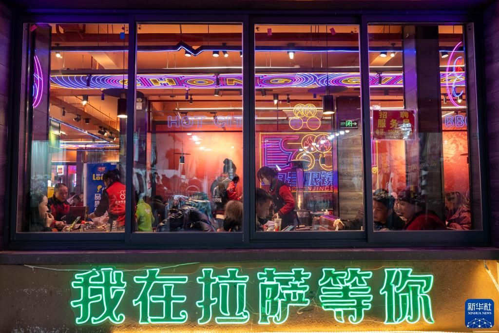 近期,拉萨夜经济逐渐升温,人们在夜幕下品尝美食、购物消费。