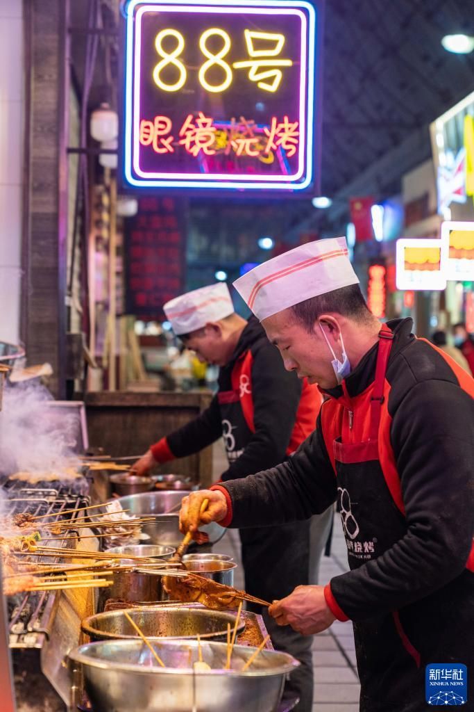 在拉萨天海夜市的烧烤店,烧烤师傅在烤串(1月10日摄)。