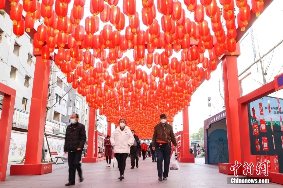 贵阳市南明区青云路举行的2023百姓新春年货节吸引民众前来游玩、购置年货。长长的走廊上挂满了红灯笼,一抬头,满眼喜气。中新网
